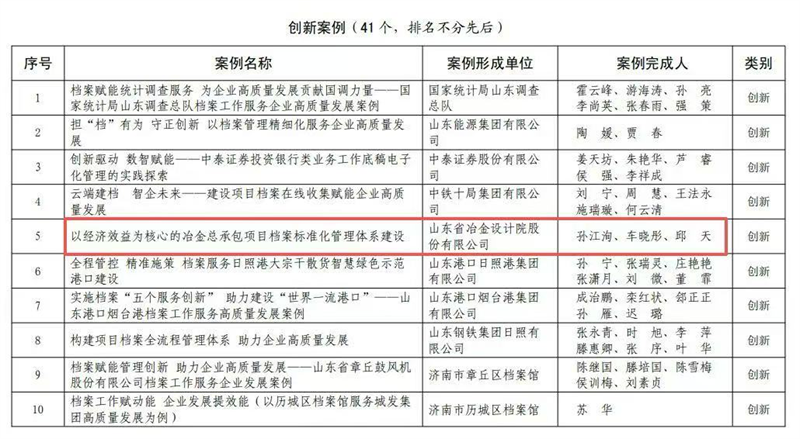 9月9日,山東省檔案館發(fā)布《關(guān)于公布全省檔案業(yè)務(wù)工作創(chuàng)新案例評選結(jié)果的通知》。其中,山冶設(shè)計(jì)申報(bào)的《以經(jīng)濟(jì)效益為核心的冶金總承包項(xiàng)目檔案標(biāo)準(zhǔn)化管理體系建設(shè)》入選“檔案服務(wù)企業(yè)高質(zhì)量發(fā)展案例”創(chuàng)新案例。此案例深入總結(jié)了山冶設(shè)計(jì)在開展總承包工程近二十年間,幾代山冶檔案人關(guān)于總承包檔案管理的經(jīng)驗(yàn),并結(jié)合公司發(fā)展需求,初步構(gòu)建起“以經(jīng)濟(jì)效益為核心的冶金總承包項(xiàng)目檔案標(biāo)準(zhǔn)化管理體系”。