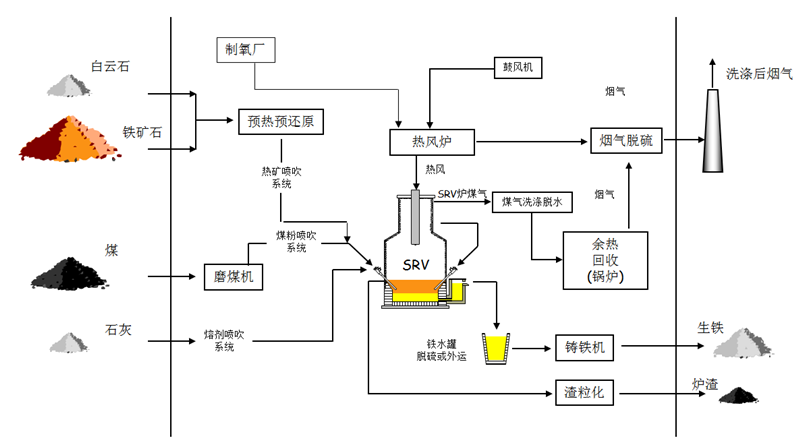 HIsmelt是一種直接熔融還原的煉鐵工藝,是典型的一步法熔融還原工藝。該工藝可直接熔煉經(jīng)預(yù)熱處理的鐵礦粉和其他適合的含鐵原料,并噴吹煤粉作為系統(tǒng)的還原剤及熱量來源。HIsmelt工藝流程圖如下: