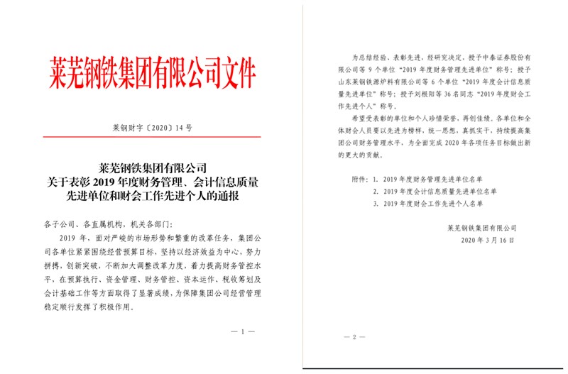 2020年3月16日,萊鋼集團(tuán)下發(fā)“關(guān)于表彰2019年度財(cái)務(wù)管理、會(huì)計(jì)信息質(zhì)量先進(jìn)單位和財(cái)會(huì)工作先進(jìn)個(gè)人的通報(bào)”,山冶設(shè)計(jì)榮獲“2019年度財(cái)務(wù)管理先進(jìn)單位”稱號(hào),創(chuàng)研公司榮獲“2019年度會(huì)計(jì)信息質(zhì)量先進(jìn)單位”稱號(hào),山冶設(shè)計(jì)財(cái)務(wù)部萬(wàn)同輝、創(chuàng)研公司財(cái)務(wù)部薛云榮獲“2019年度財(cái)會(huì)工作先進(jìn)個(gè)人”稱號(hào)。