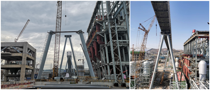 5#通廊在4000噸米塔吊和350噸履帶吊相互合力下,經(jīng)過近6個小時的吊裝,順利達(dá)到68.90米就位高度,按計劃節(jié)點提前7天完成高爐主皮帶通廊的整體鋼結(jié)構(gòu)安裝。這是萊鋼1#3800m3高爐本體工程中吊裝高度最高、單體重量最重、跨度最大的鋼結(jié)構(gòu)件,5號通廊成功安裝,為后續(xù)設(shè)備安裝、通廊封閉、設(shè)備單機(jī)調(diào)試等創(chuàng)造了有利條件,同時給其他各參建單位做了號的榜樣,便于帶動其他工序積極作業(yè)施工。