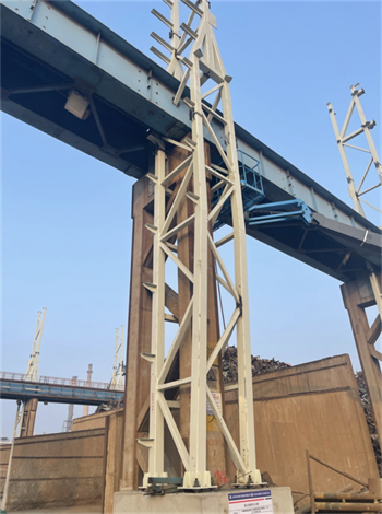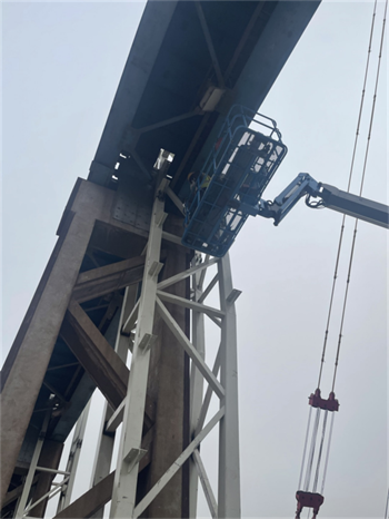 項目開工后,項目部將施工圖與現(xiàn)場實際巧妙結(jié)合,立足保證原棧橋系統(tǒng)完整、獨立運行為宗旨,攻克多項改造重點、難點。如利舊原有承臺短柱、鋼柱貫穿制動板現(xiàn)場加固、斜桿穿吊車梁腹板并規(guī)避電纜橋架等障礙物、大跨度屋面桁架梁跨外吊裝等。提前策劃好每個節(jié)點,做到現(xiàn)場施工完全落實設(shè)計意圖,實現(xiàn)了結(jié)構(gòu)安全、質(zhì)量可靠、進(jìn)度可控、經(jīng)濟(jì)合理。