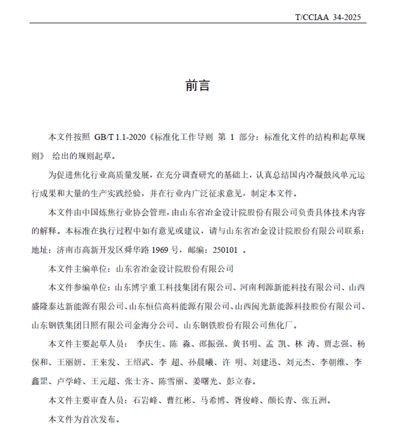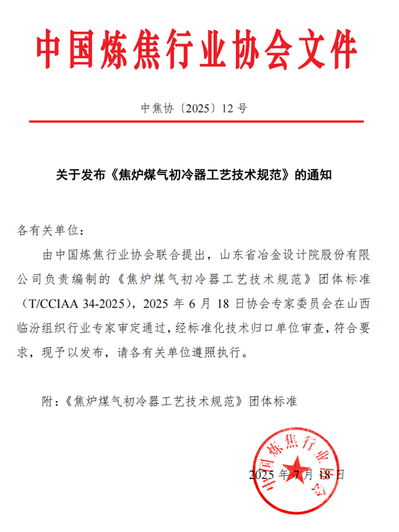 7月18日,由山冶設(shè)計主編的《焦?fàn)t煤氣初冷器工藝技術(shù)規(guī)范》T/CCIAA 34-2025(簡稱《規(guī)范》)正式發(fā)布并實施。《規(guī)范》對焦化煤氣凈化初冷器的工藝流程、操作參數(shù)以及質(zhì)量指標(biāo)作出了詳細(xì)規(guī)定,同時統(tǒng)一了初冷器的設(shè)計與操作標(biāo)準(zhǔn),保障了煤氣冷卻過程的高效性與安全性?!兑?guī)范》的發(fā)布與實施,可指導(dǎo)焦化企業(yè)在生產(chǎn)過程中有效把控初冷器的日常操作,為后續(xù)煤氣凈化及深加工的穩(wěn)定運(yùn)行創(chuàng)造有利條件。這是繼2024年7月1日正式實施、山冶設(shè)計主編的《焦?fàn)t煤氣脫硫廢液干法制酸技術(shù)規(guī)范》YB/T6115 - 2023之后的又一個行業(yè)規(guī)范,充分體現(xiàn)了山冶設(shè)計在焦化行業(yè)的技術(shù)引領(lǐng)作用與品牌影響力。